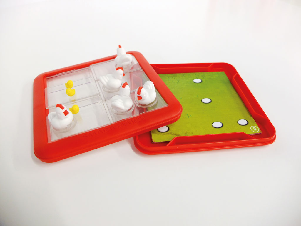 - Inside the BoxGame board with storage compartment, 5 transparent puzzle pieces with chickens and chicks, challenge cards with 48 challenges, leaflet with solutions.