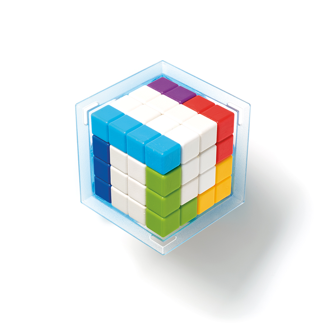 Can you create 3D patterns with the 8 colorful puzzle pieces and their 8 white counterparts? Put your spatial insight, logic and deduction skills to work as you create cubes with a unique colour pattern in each challenge! The transparent tray opens to become your game board.