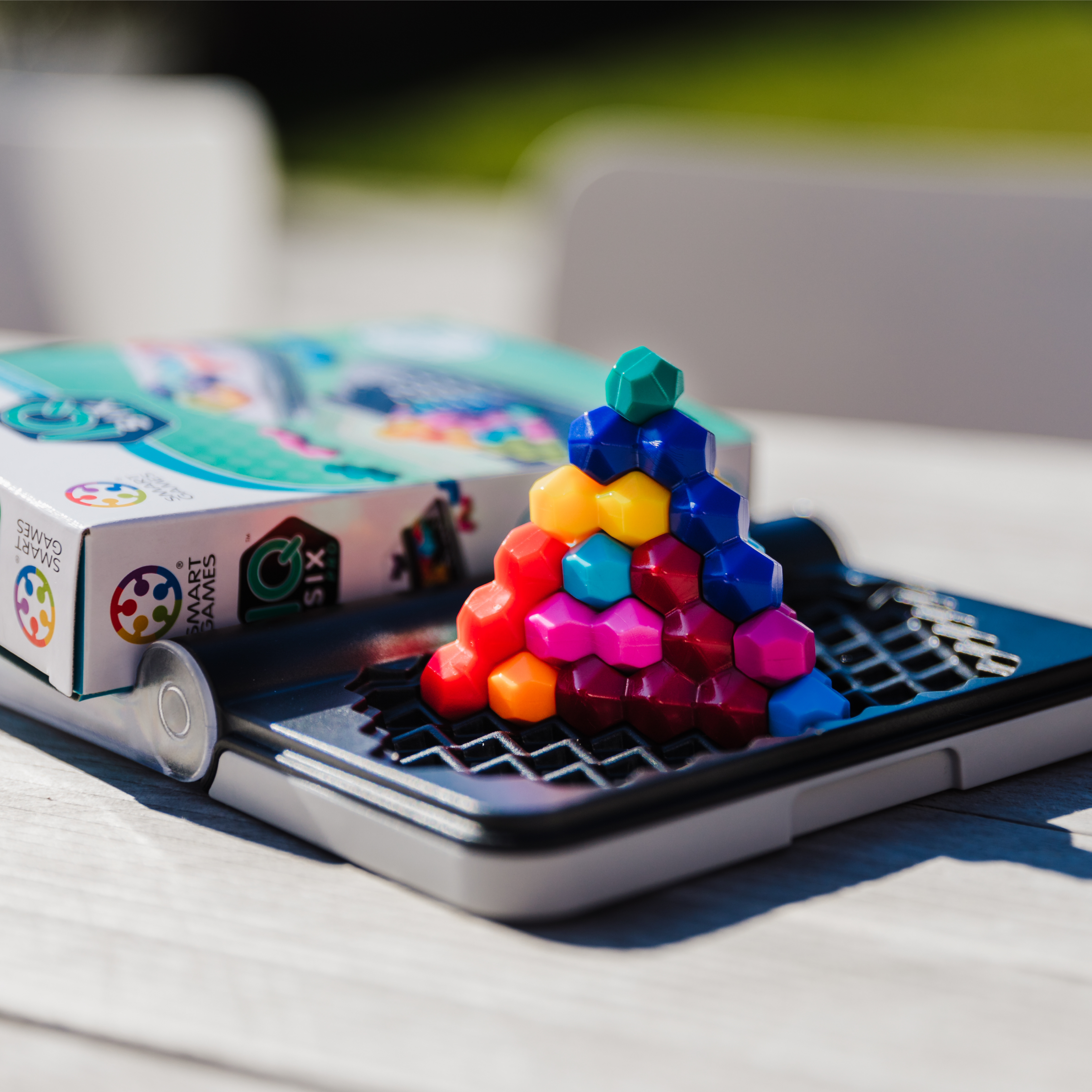 - Inside the Box1 compact game board with transparent lid, 12 colourful puzzle pieces and 1 booklet with 120 challenges and solutions.