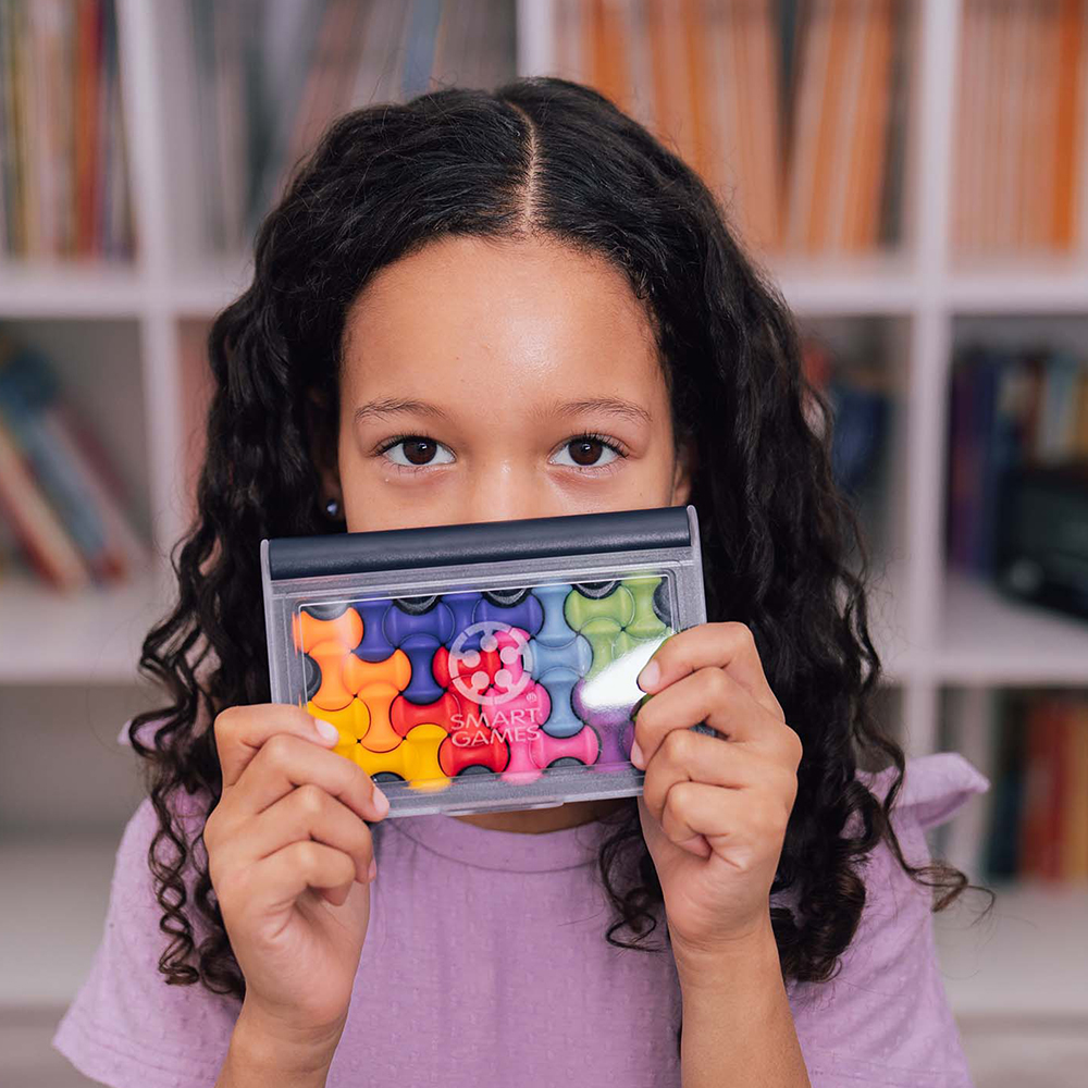 - Inside the Box1 compact game board with transparent lid, 8 puzzle pieces, 1 booklet with 120 challenges and solutions.