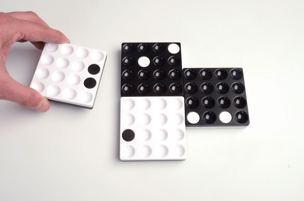 Fit all the puzzle pieces on the game board you just made. You can't place any puzzle pieces on top of the black or white dots.